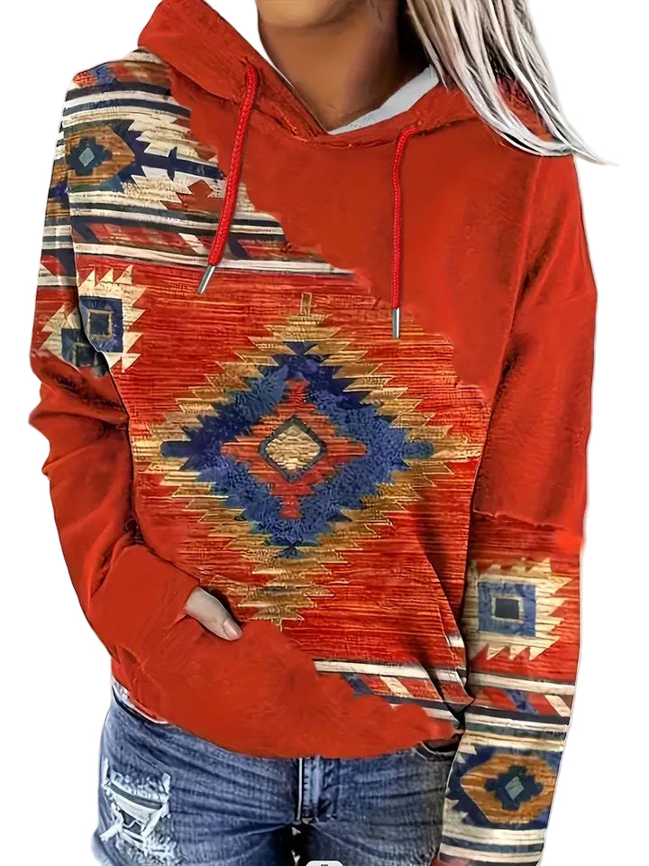 Tröjan har ett trendigt aztekiskt mönster och en mysig huva som gör den till ett utmärkt val för kalla dagar. Den är tillverkad av mjuka textilier som ger en bekväm passform och en modern look.