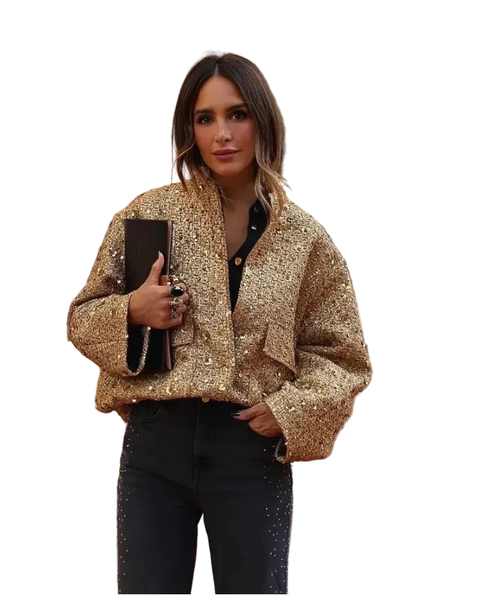 Med sitt unika paljettmönster och tidlösa design är denna jacka ett måste i din garderob. Den är perfekt för både festliga och avslappnade tillfällen, vilket gör den till en mångsidig favorit.