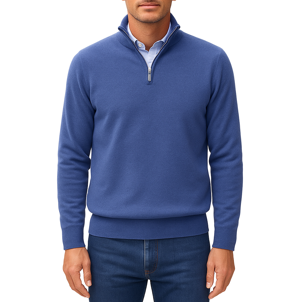 Denna zip krage stickade tröja för herr erbjuder en perfekt kombination av stil och komfort. Med sin moderna design och smala silhuett kommer du att känna dig både avslappnad och stilfull oavsett tillfälle.